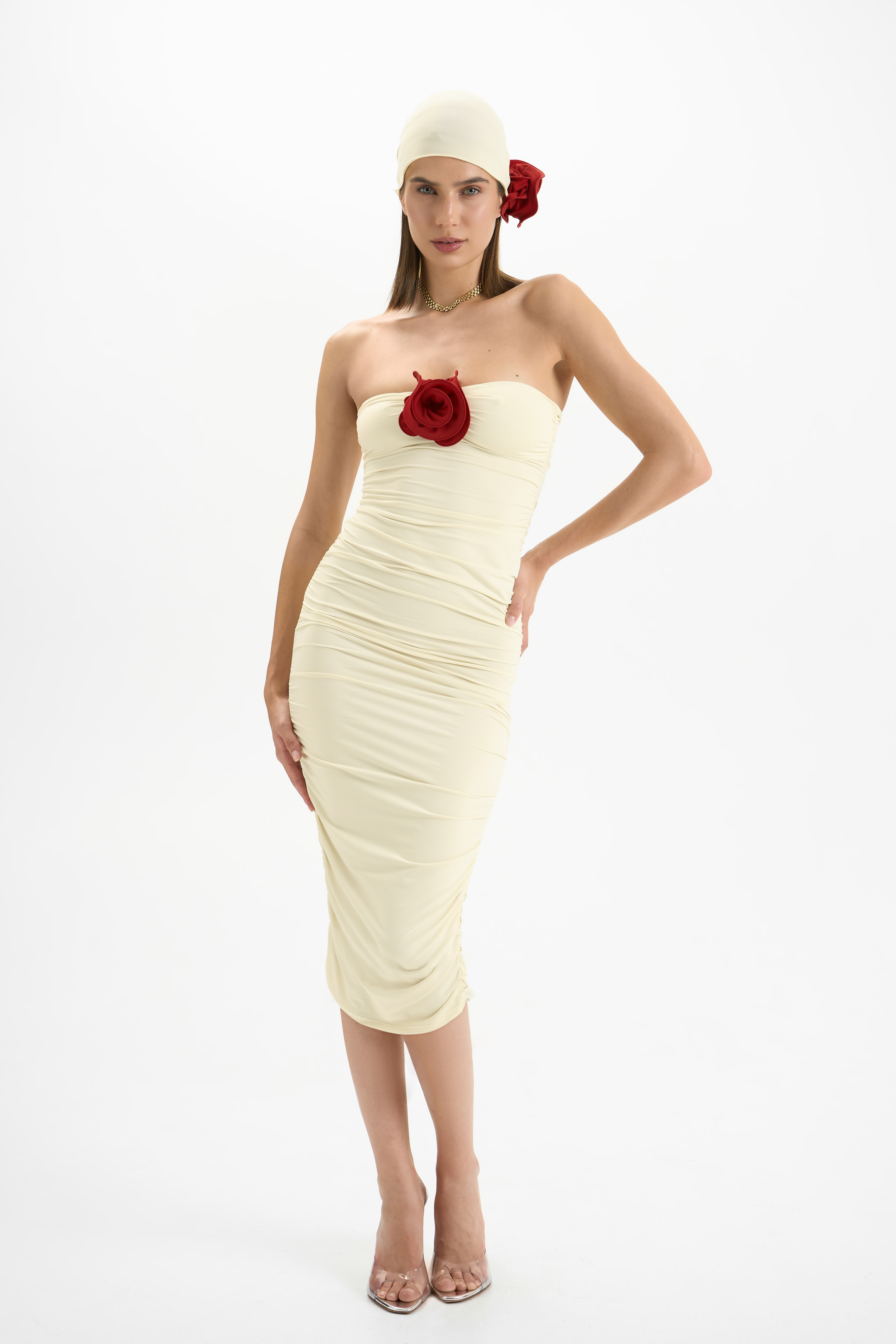 A strapless midi dress with a draped construction.
